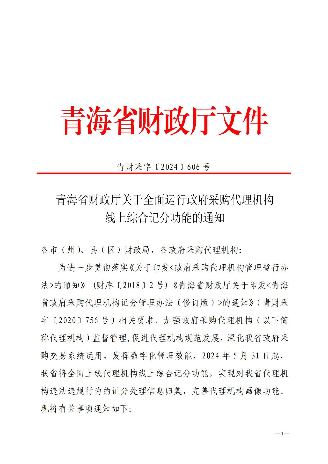 青海省財政廳關(guān)于全面運行政府采購 代理機構(gòu)線上綜合記分功能的通知