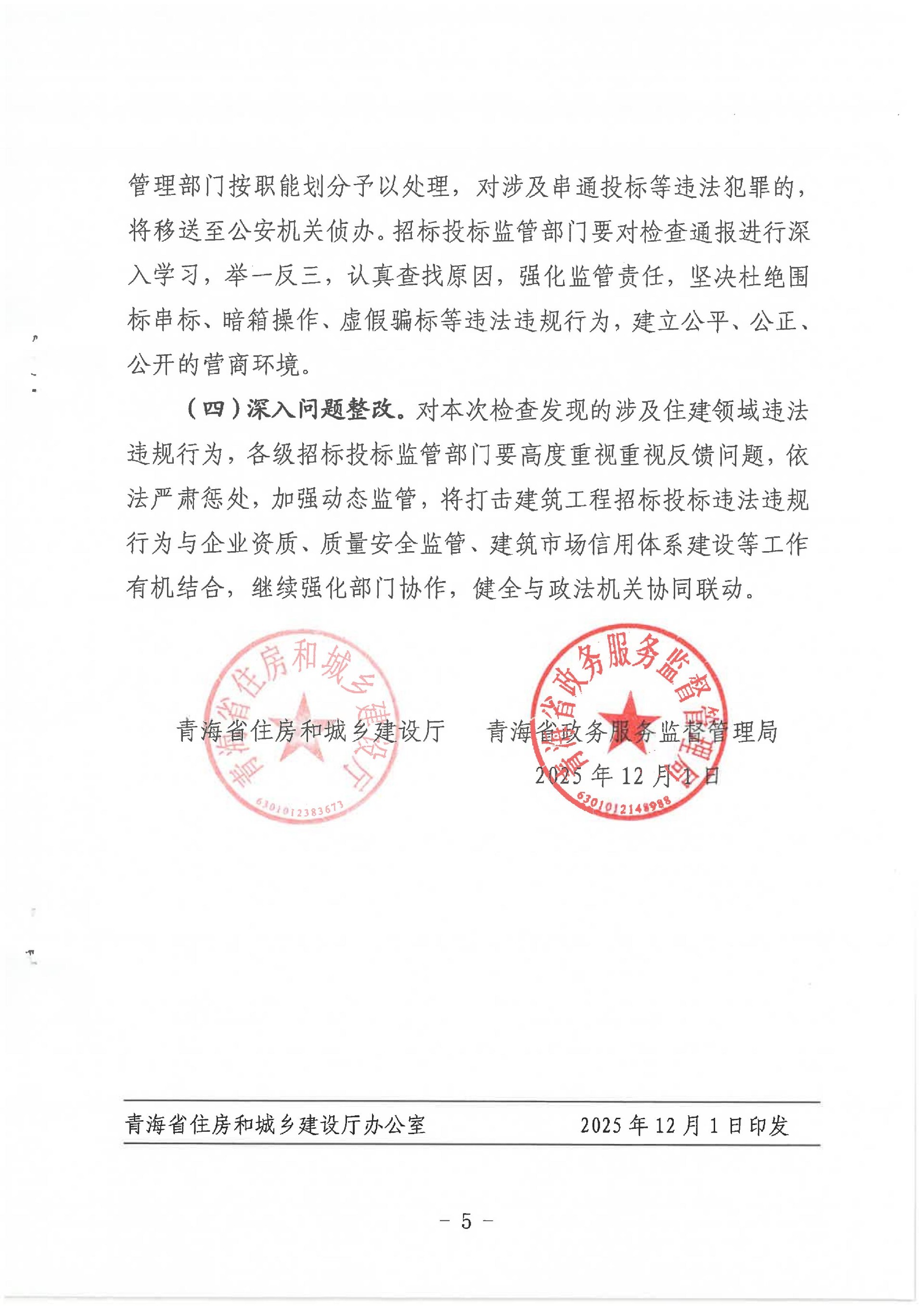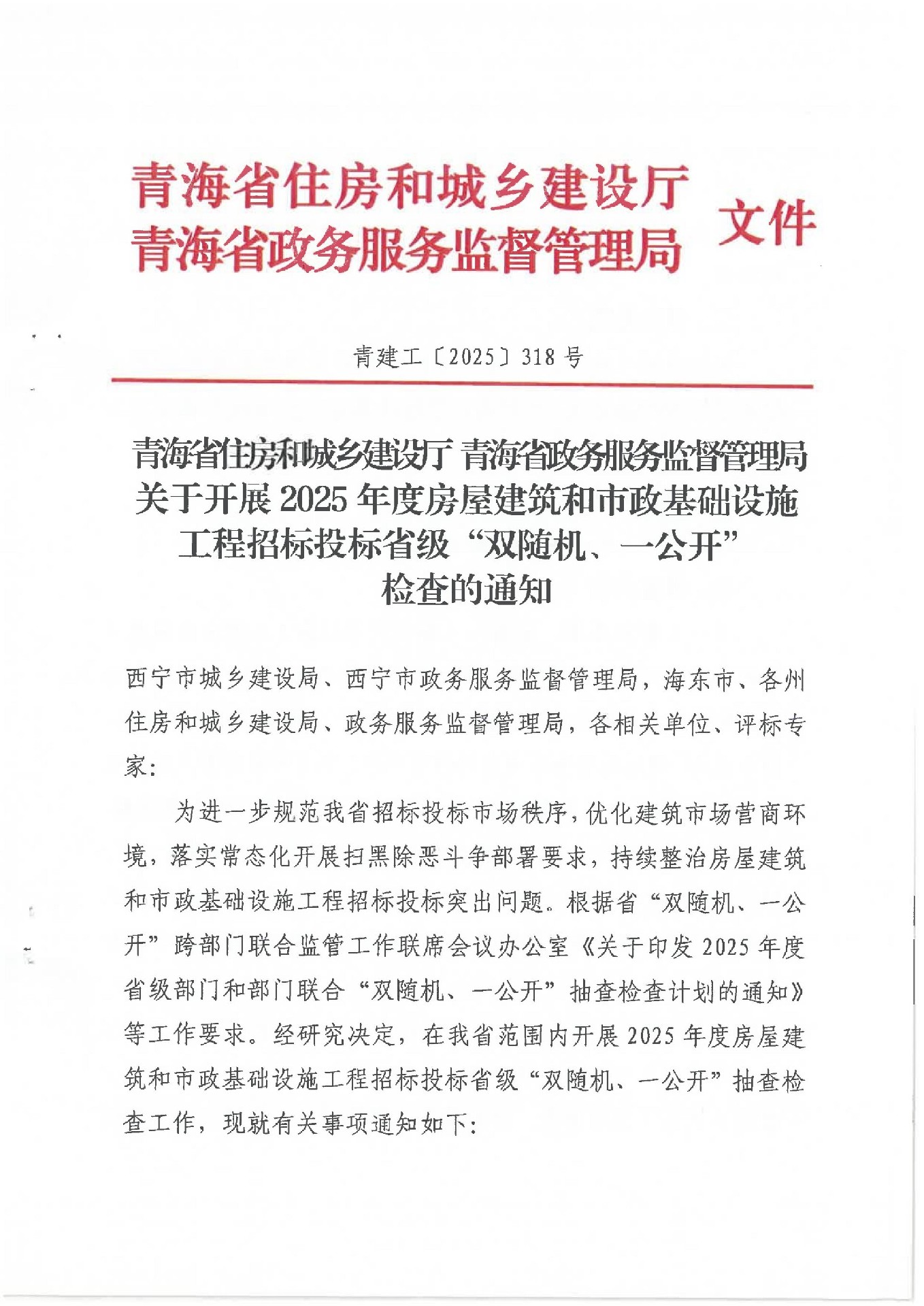青海省住房和城鄉(xiāng)建設(shè)廳 青海省政務(wù)服務(wù)監(jiān)督管理局關(guān)于開展2025年度房屋建筑和市政基礎(chǔ)設(shè)施工程招標投標省級“雙隨機、一公開” 檢查的通知
