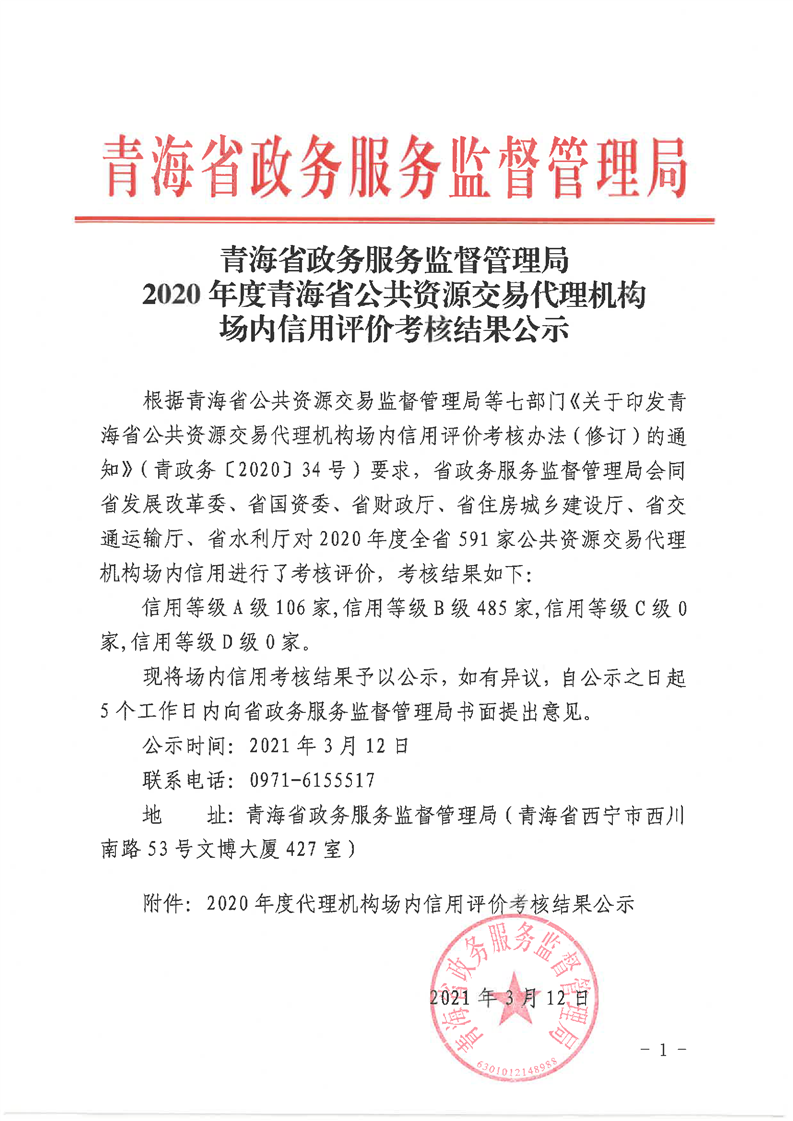 青海省政務(wù)服務(wù)監(jiān)督管理局2020年度青海省公共資源交易代理機(jī)構(gòu)場內(nèi)信用評(píng)價(jià)考核結(jié)果公示