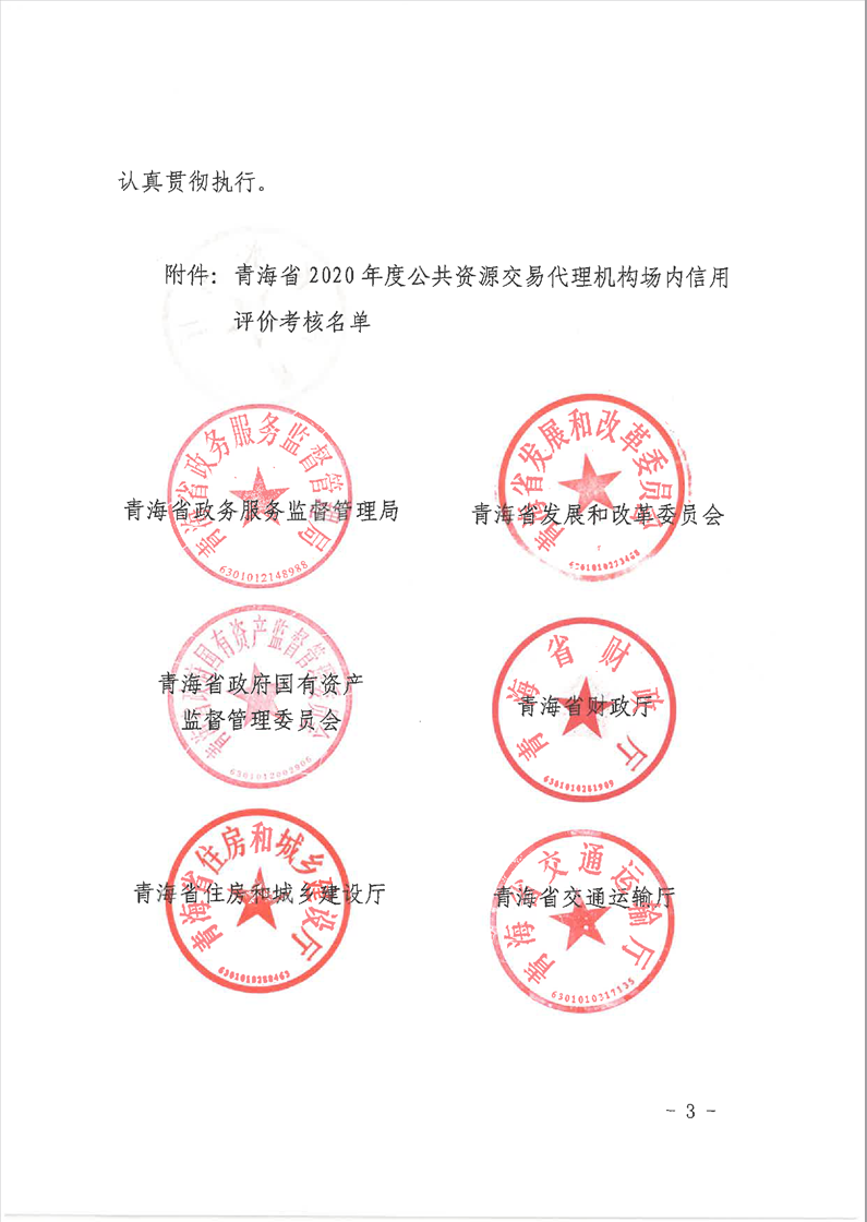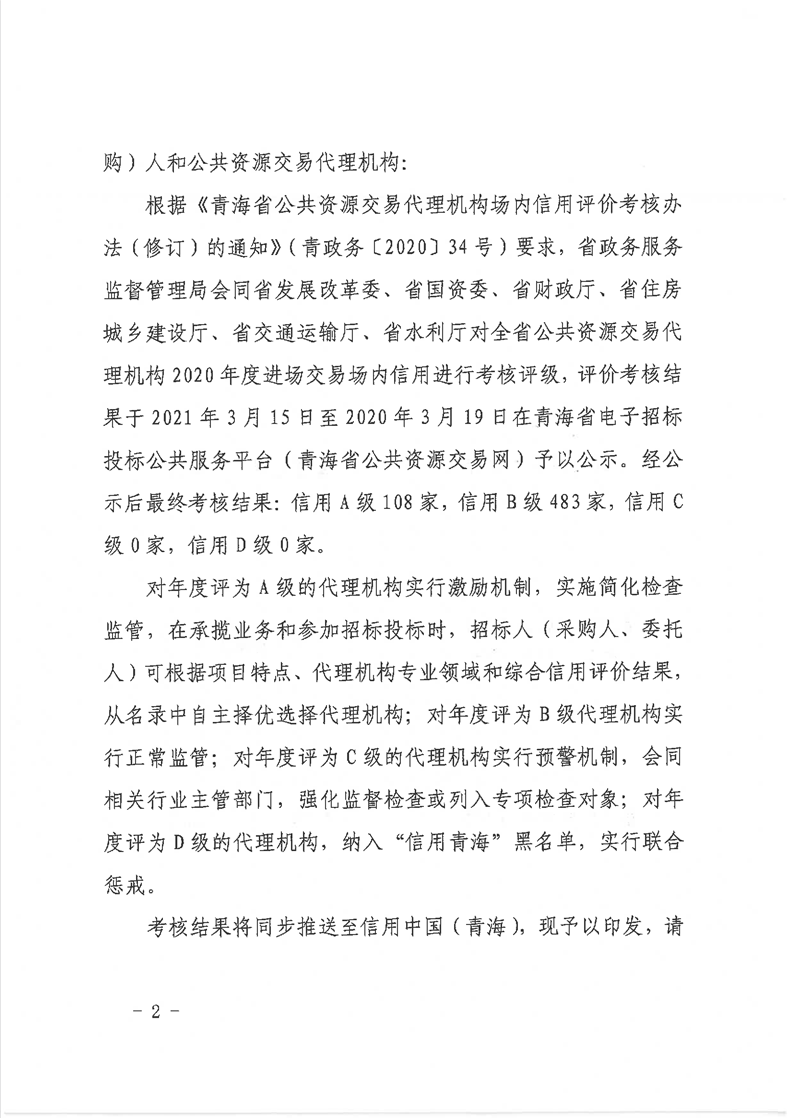 青海省七部門聯(lián)合印發(fā)《2020年度青海省公共資源交易代理機(jī)構(gòu)場(chǎng)內(nèi)信用評(píng)價(jià)考核結(jié)果的通知》
