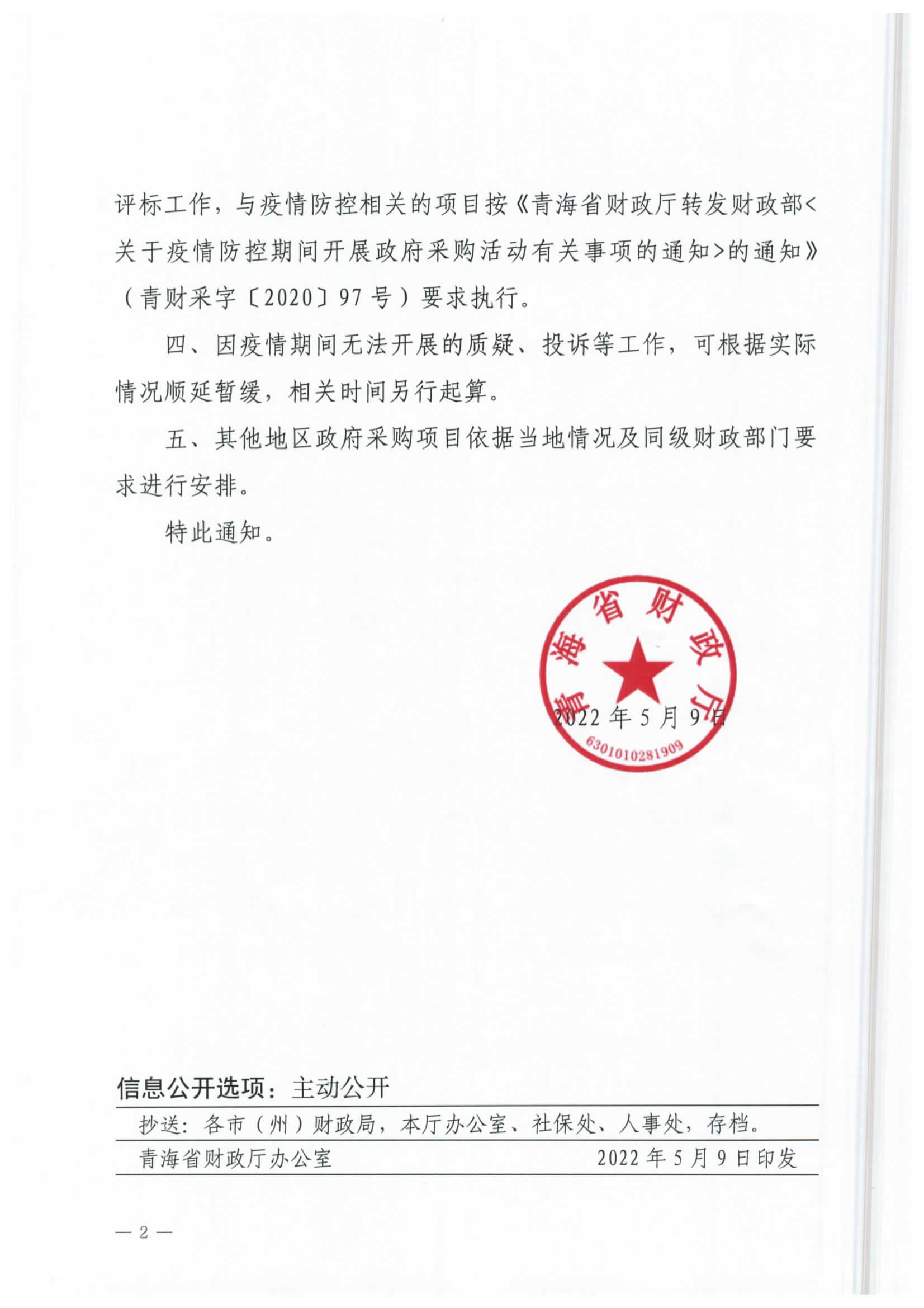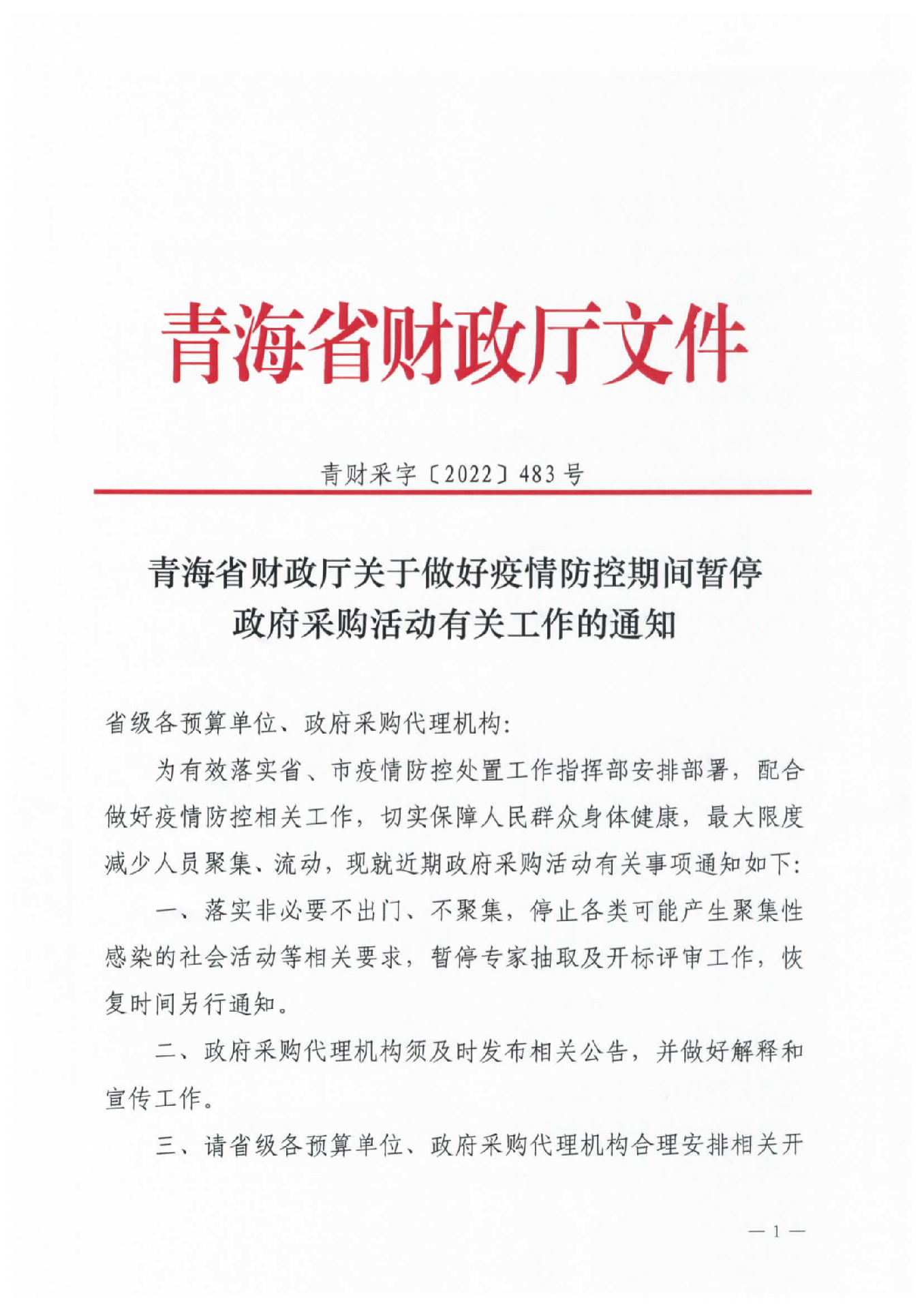 青海省財政廳關于做好疫情防控期間暫停政府采購活動有關工作的通知