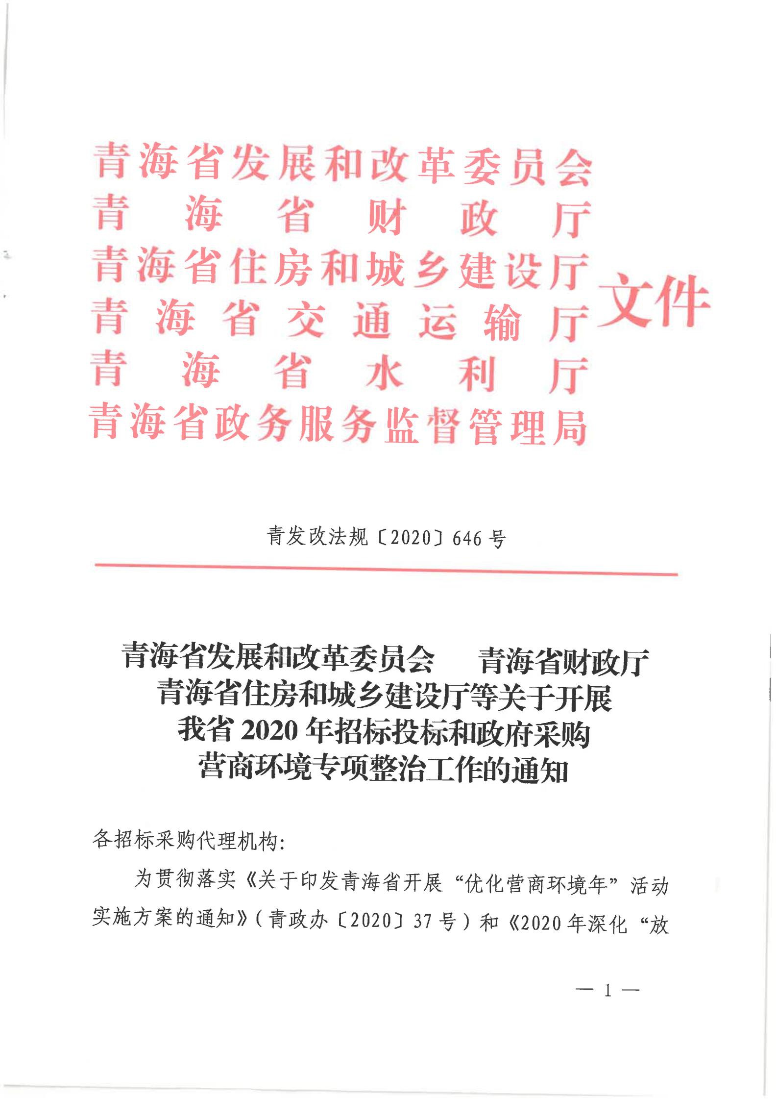 青海省發(fā)展和改革委員會(huì)青海省財(cái)政廳青海省住房和城鄉(xiāng)建設(shè)廳等關(guān)于開展我省2020年招標(biāo)投標(biāo)和政府采購營商環(huán)境專項(xiàng)整治工作的通知