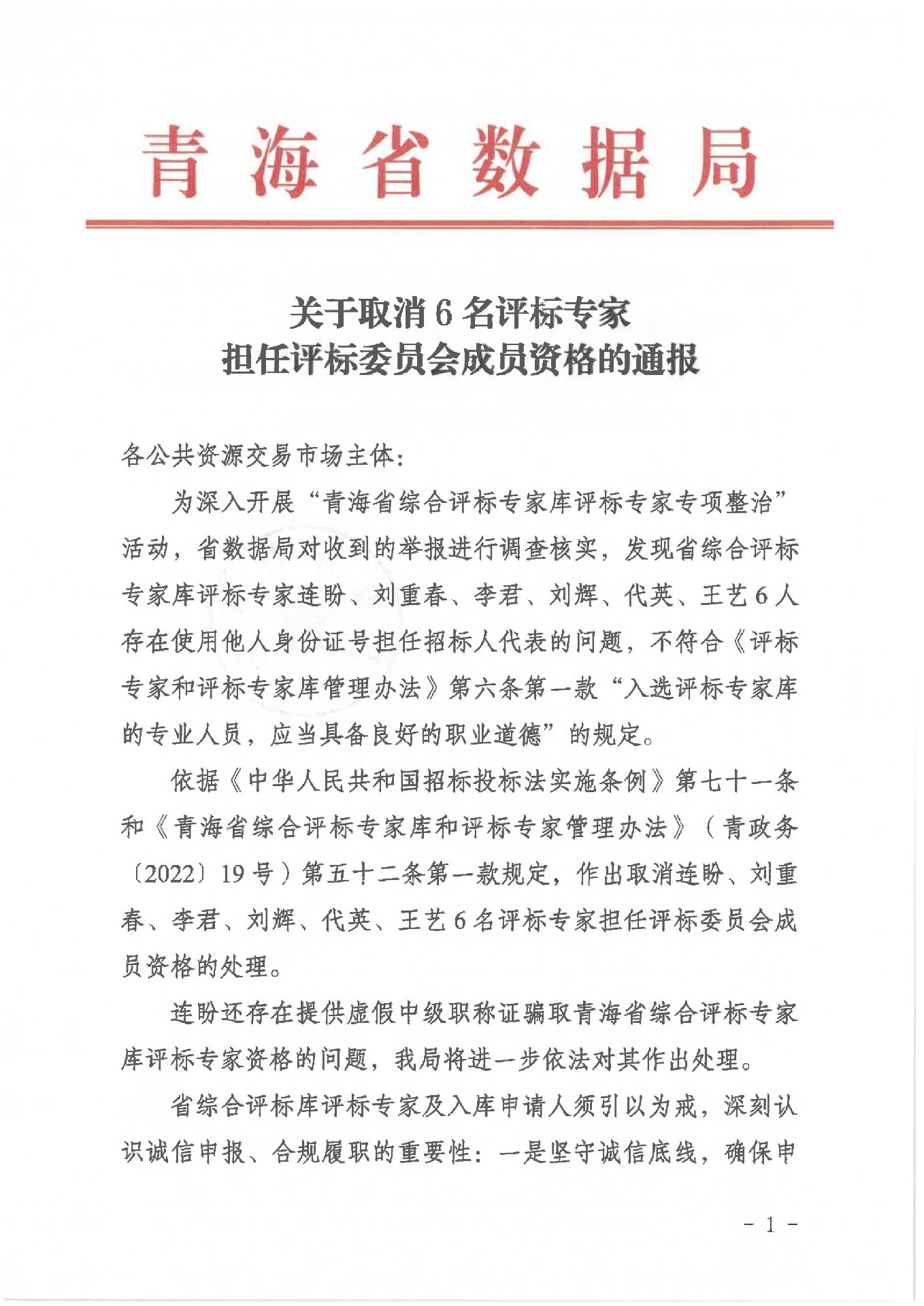 轉(zhuǎn)發(fā)青海省數(shù)據(jù)局關(guān)于取消6名評(píng)標(biāo)專家擔(dān)任評(píng)標(biāo)委員會(huì)成員資格的通報(bào)